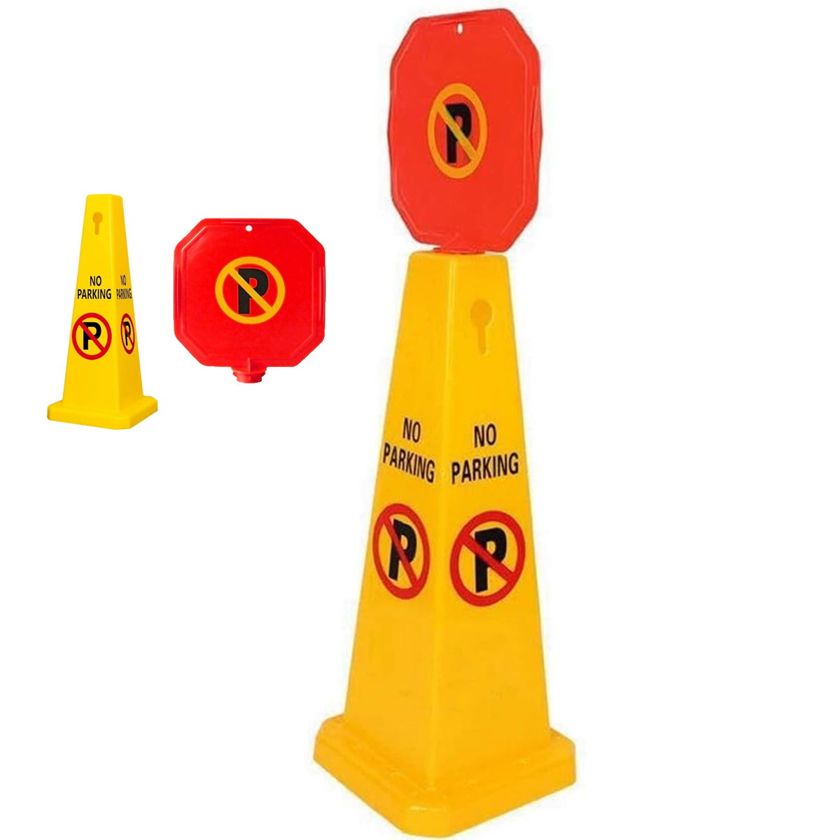 Este cone de trânsito amarelo vibrante apresenta um aviso de "Proibido Estacionar" e um símbolo claro de proibido estacionar para máxima visibilidade.