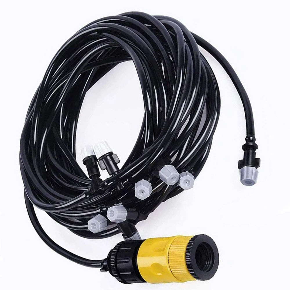 Kit Sistema de Climatização e resfriamento ideal para quintais, varandas, barracas gazebos e locais abafados que necessitam de diminuição na temperatura. A mangueira Possui 10 metros com 10 bicos pulverizadores que distribuem a névoa de água uniformemente pelo espaço, o kit vem com conector para torneiras e com braçadeiras para prender a mangueira em locais suspensos ou verticais.