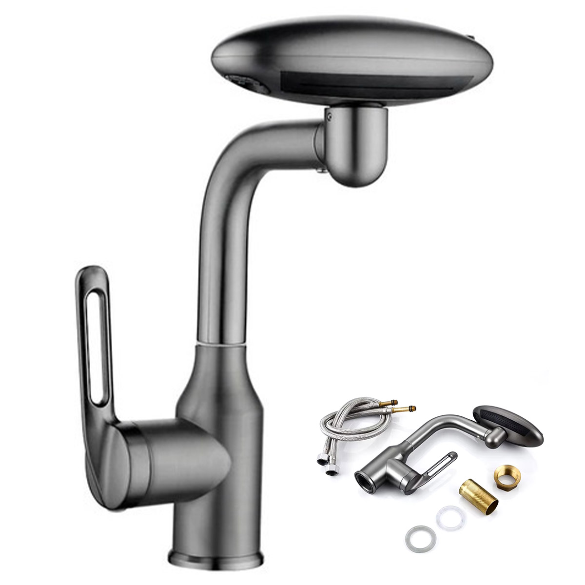 A torneira possui rotaçao 360 graus, ângulos ajustáveis e flexíveis. E a torneira possui 4 modos de jatos de agua (cascata, cortina de água, modo bolha e coluna vertical), para trocar os modo basta girar a torneira.